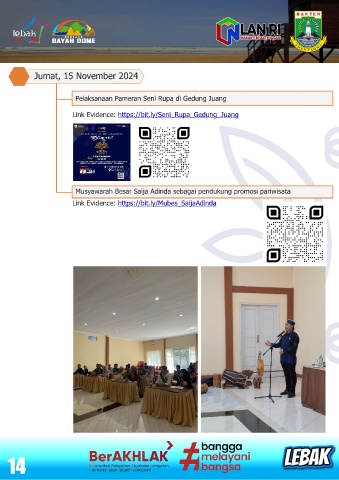 Jumat, 15 November 2024 Pelaksanaan Pameran Seni Rupa di Gedung Juang Link Evidence: https://bit.ly/Seni_Rupa_Gedung_Juang Musyawarah Besar Saija Adinda sebagai pendukung promosi pariwisata Link Evidence: https://bit.ly/Mubes_SaijaAdinda 14